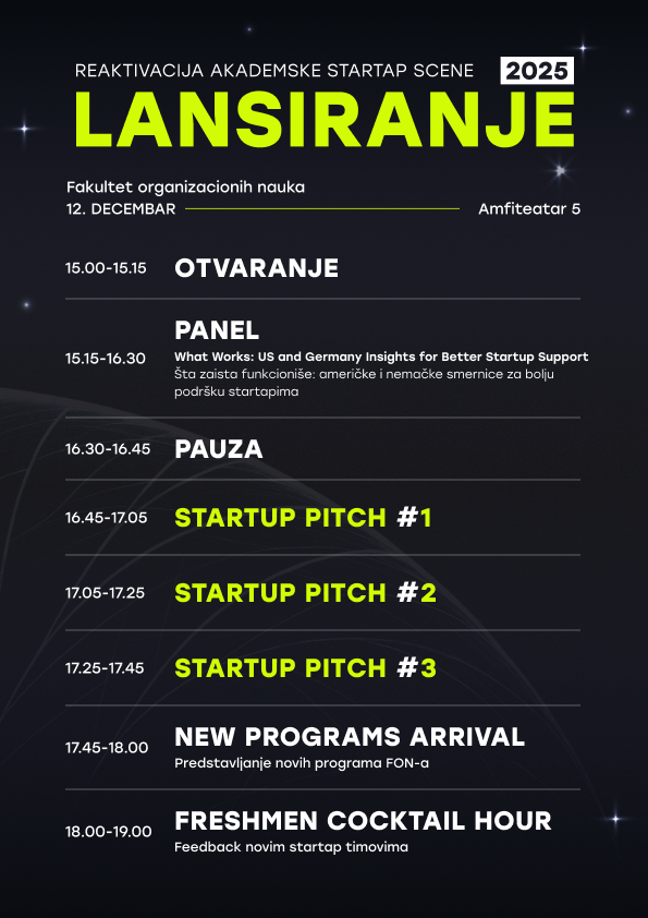У петак, 12. децембра, са почетком у 15 часова, на Факултету организационих наука организује се ЛАНСИРАЊЕ 2025 – годишњи догађај факултета на којем се представљају кључни резултати и нове иницијативе из области иновационог академског предузетништва.