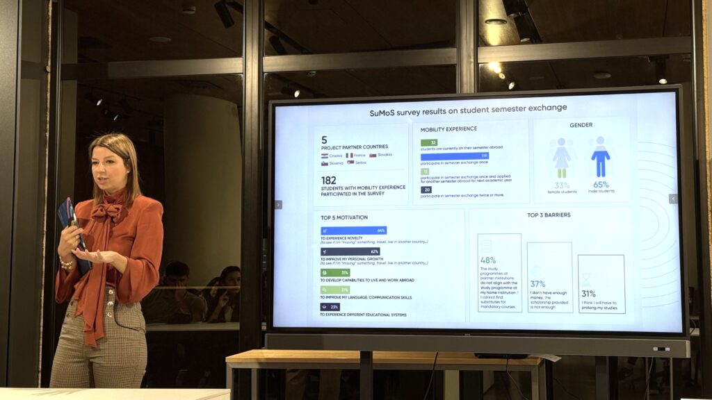 У оквиру програма, Бојана Ивановић Бован, стручни сарадник за међународну сарадњу, представила је резултате Еразмус+ пројекта SuMoS – Strengthening the ecosystem for sustainable student mobility, који ФОН реализује са партнерима из Европе у циљу унапређења одрживих и дигиталних мобилности. Представљени су и резултати истраживања спроведеног међу пет партнерских универзитета (Универзитет у Загребу, Факултет организације и информатике, Хрватска – координатор, Groupe ESIEA, Француска, Универзитет у Жилини, Факултет менаџмента и информатике, Словачка, Универзитет у Марибору, Факултет организационих наука, Словенија, Универзитет у Београду, Факултет организационих наука, Србија) које је анализирало мотивационе факторе и баријере за одлазак студената на размену. Истраживање је показало да су најчешћи мотиви студената: жеља да доживе нешто ново, лични развој, стицање способности за живот и рад у иностранству, унапређење језичких и комуникационих вештина, као и упознавање различитих образовних система. Као главне препреке за учешће у програмима мобилности, студенти су навели: неусклађеност студијских програма (48%), недостатак финансијских средстава (37%) и страх да ће размена продужити трајање студија (31%).