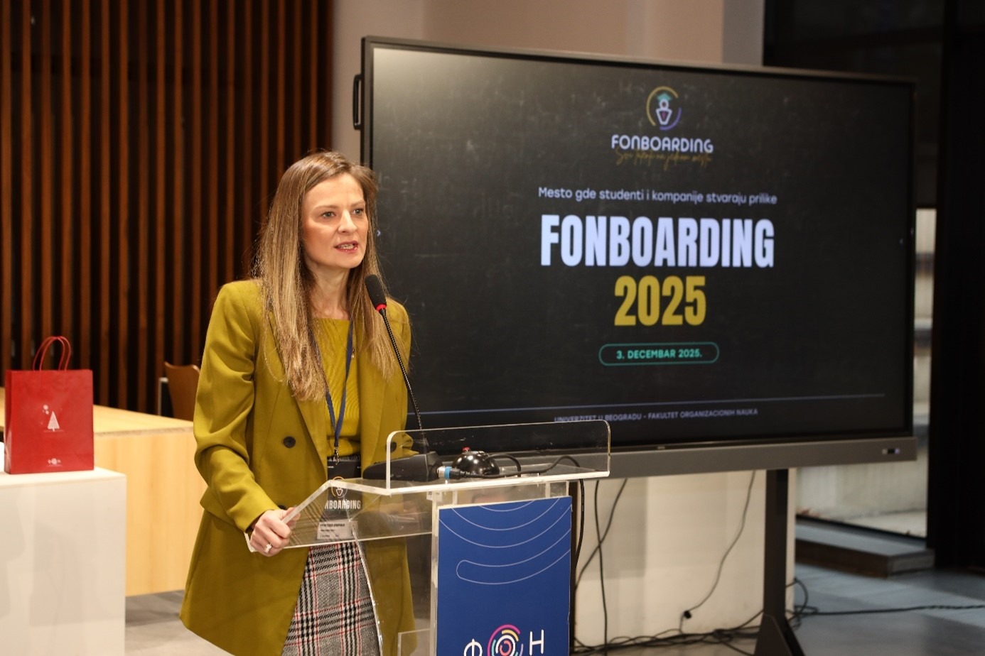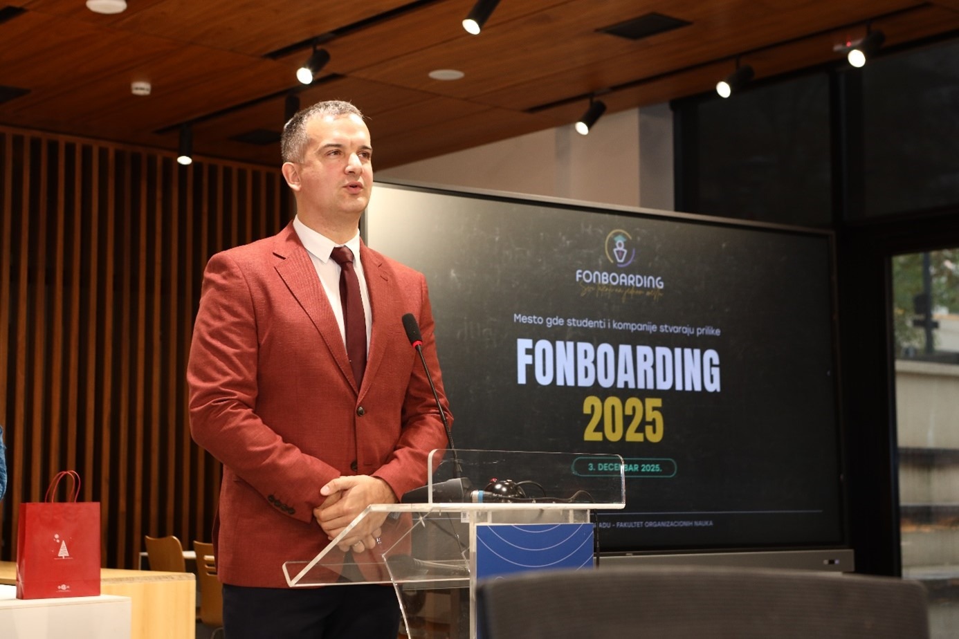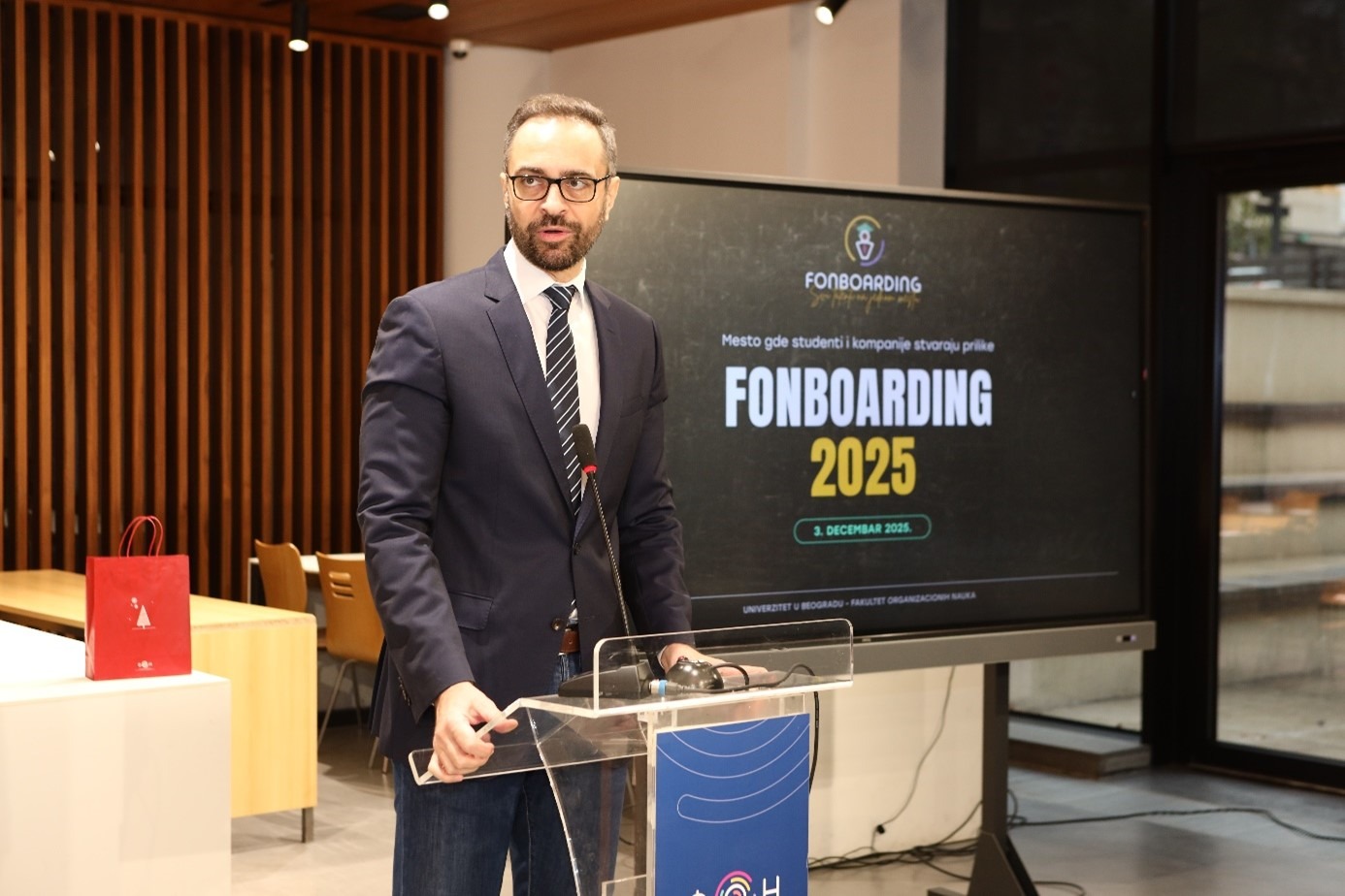 Декан ФОН-а, проф. др Марко Михић, свечано је отворио догађај и том приликом се обратио присутнима: „FONBoarding студентима омогућава да из прве руке упознају корпоративну културу, модерне пословне праксе и конкретне изазове са којима се компаније суочавају на домаћем и међународном тржишту. Kроз интерактивне сесије, панел-дискусије, радионице и разговоре један на један, наши студенти стичу непроцењиво практично искуство, унапређују своје вештине и добијају јаснији увид у то како изгледа пут од факултета до успешне професионалне каријере. Циљ овог догађаја јесте да подстакне развој младих талената, ојача сарадњу између факултета и привреде и инспирише студенте да препознају и развију своје потенцијале. Kонтинуирано поверење водећих компанија и њихово активно учешће у програму потврђују значај FONBoarding-а као платформе која доприноси стварању компетентних, мотивисаних и конкурентних будућих лидера.“